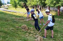 Учащиеся школы помогают в подготовке школы к новому учебному году. Идет уборка скошенной травы.