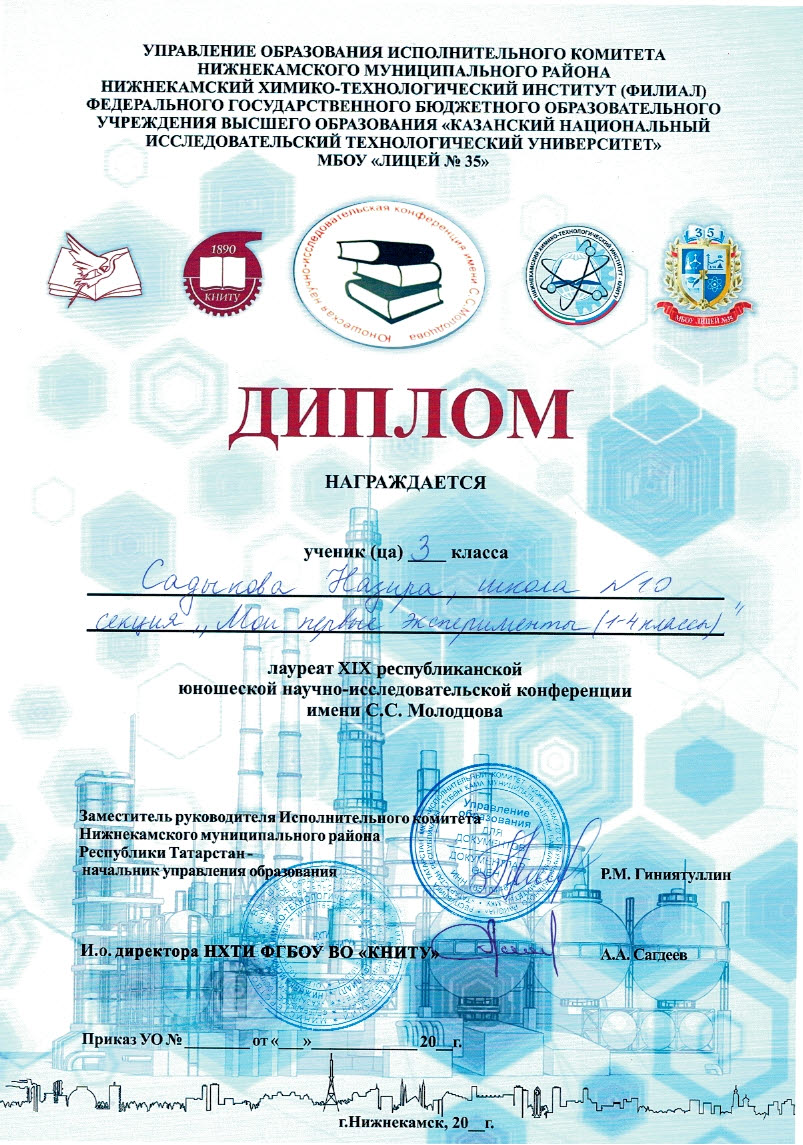 В онлайн-зале II республиканской научно-практической конференции им. А.М. Бутлерова побывала и Садыкова Назира, ученица 3А класса со своей работой «Не имя красит человека, а человек - имя". Она принимала участие в секции "Год родных языков и народного единства". Награждена Дипломом III степени.
