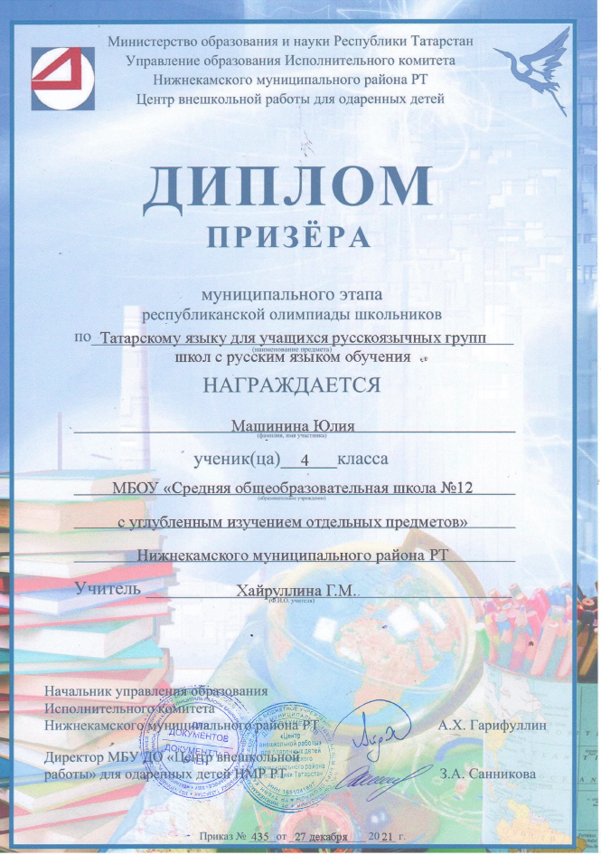 Муниципальное бюджетное общеобразовательное учреждение «Средняя общеобразовательная школа №12 с углубленным изучением отдельных предметов» Нижнекамского муниципального района Республики/ Татарстан Республикасы Түбән Кама муниципаль районының «Аерым фәннәрне тирәнтен өйрәнүле 12 нче гомуми урта белем бирү мәктәбе» муниципаль бюджет гомуми белем бирү учреждениесе