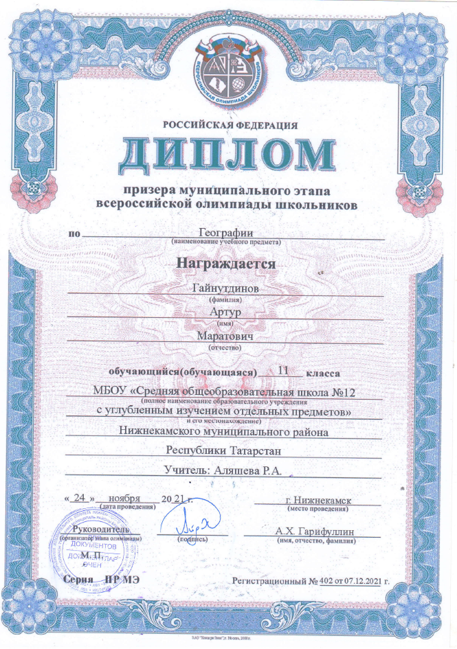 Обучающийся 11 класса Гайнутдинов Артур стал призером муниципального этапа всероссийской олимпиады школьников сразу по двум предметам: биологии и географии!