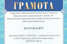 Коллектив МБОУ "СОШ №12", был награжден грамотой, занявший второе место в XIII Спартакиаде работников образования (Вторая лига) 31.05.2019