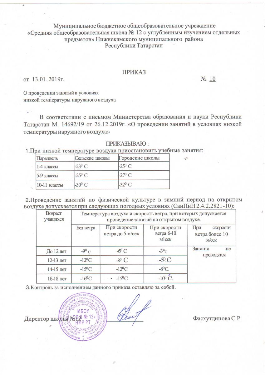 Приказ о проведении занятий в условиях низкой температуры наружного воздуха
