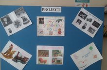 На втором этаже школы выставлены проектные работы учеников 6 класса "Игрушки моих родителей"