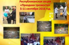 С 5 по 11 сентября 2016 года в нашей школе для улучшения борьбы с алкогольной зависимостью и популяризацией трезвого образа, а также вовлечения подростков и молодёжи в данную деятельность, проходила республиканская акция «Праздник трезвости», приуроченная к Всероссийскому Дню трезвости – 11 сентября. В период проведения акции в школе организовывались встречи с участием профильных специалистов с использованием информационного материала по вопросам профилактики алкоголизма среди всех категорий населения, лекции, рисунки мелом на асфальте, просмотр видеороликов, беседы с учащимися по профилактике злоупотреблений спиртосодержащей продукцией, а так же прохожим раздавались листовки с полезной информацией об этом новом празднике