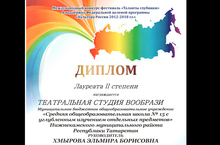 В 2013 гоуд школьная театральная студия "Вообрази" (руководитель Хмырова Э.Б) дважды становилась Лауреатом Международных конкурсов и была награждена Дипломами 2 степени