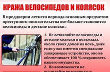 - не оставлять велосипед без присмотра, как в подъездах домов, так и на улице рядом с магазинами и торговыми центрами, не доверять присмотр за велосипедом случайным и незнакомым людям;