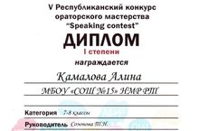 Ученица 7 б класса Камалова Алина заняла первое место в Республиканском конкурсе Ораторского Мастерства ( на английском языке).Руководитель:Созонова Татьяна Николаевна.