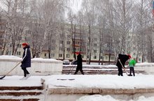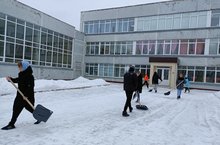 Ребята выпускных классов помогают в уходе за пришкольной территорией школы во время зимних каникул