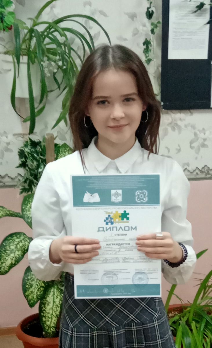 Ученица 9А класса Фардиева Олеся стала победителем РЕСПУБЛИКАНСКОГО КОНКУРСА ПРОФЕССИОНАЛЬНОГО МАСТЕРСТВА "ЮНЫЙ ПРОФЕССИОНАЛ". Поздравляем от всей души! Так держать!!!