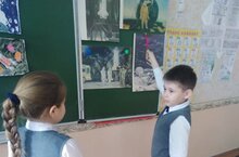 Урок родного языка в школьном музее. Ребята узнали о дне космонавтики, о первом космонавте Ю.А.Гагарине, о приземлении космического аппарата в Заинском районе с собакой Чернушкой на борту.