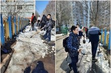 9 апреля ученики 6 а класса приняли участие в «Экологическом двухмесячнике», для быстрого таяния, раскрадывали снег на школьной территории.