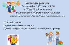 в СОШ № 19 состоится родительское собрание и начинаются платные занятия для будущих первоклассников.