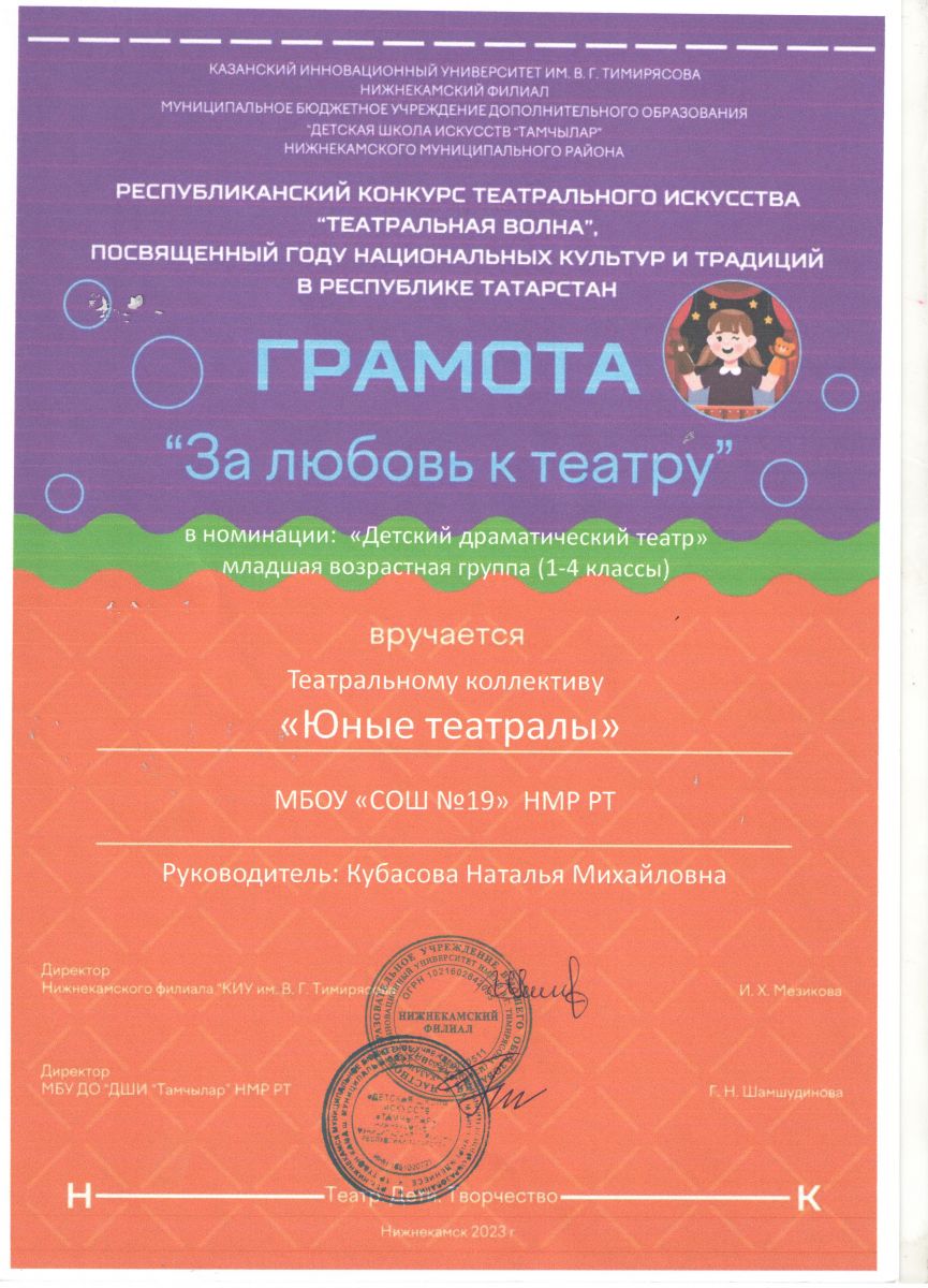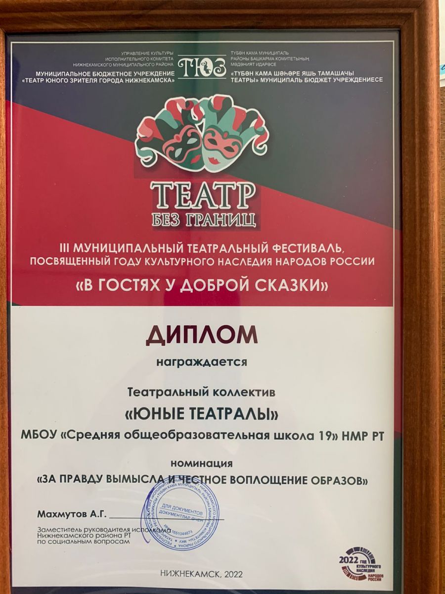 Диплом III степени, фестиваль – конкурс театрального искусства «Театральная волна» (номинация «Детский драматический театр»), 2019 год;