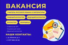 В школе имеются вакансии учителя русского языка и литературы, главного бухгалтера, ведущего бухгалтера, бухгалтера, специалиста по кадрам, уборщицы. Обращаться по адресу Юности, д.4. или по телефону 8(8555)43-20-79