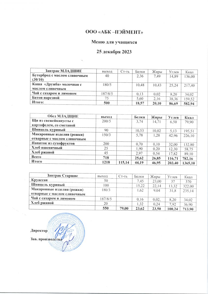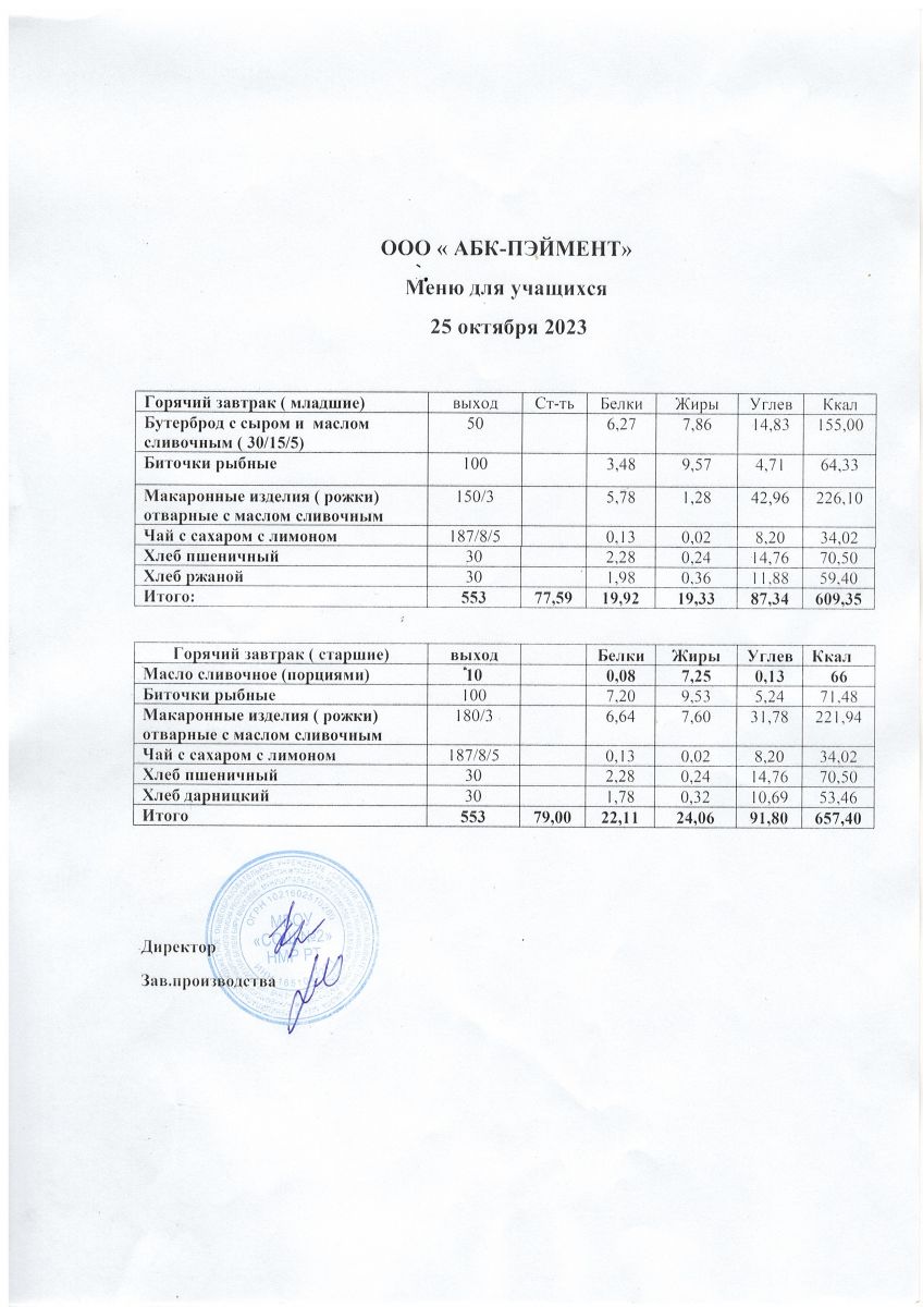 МЕНЮ на 25.10.2023