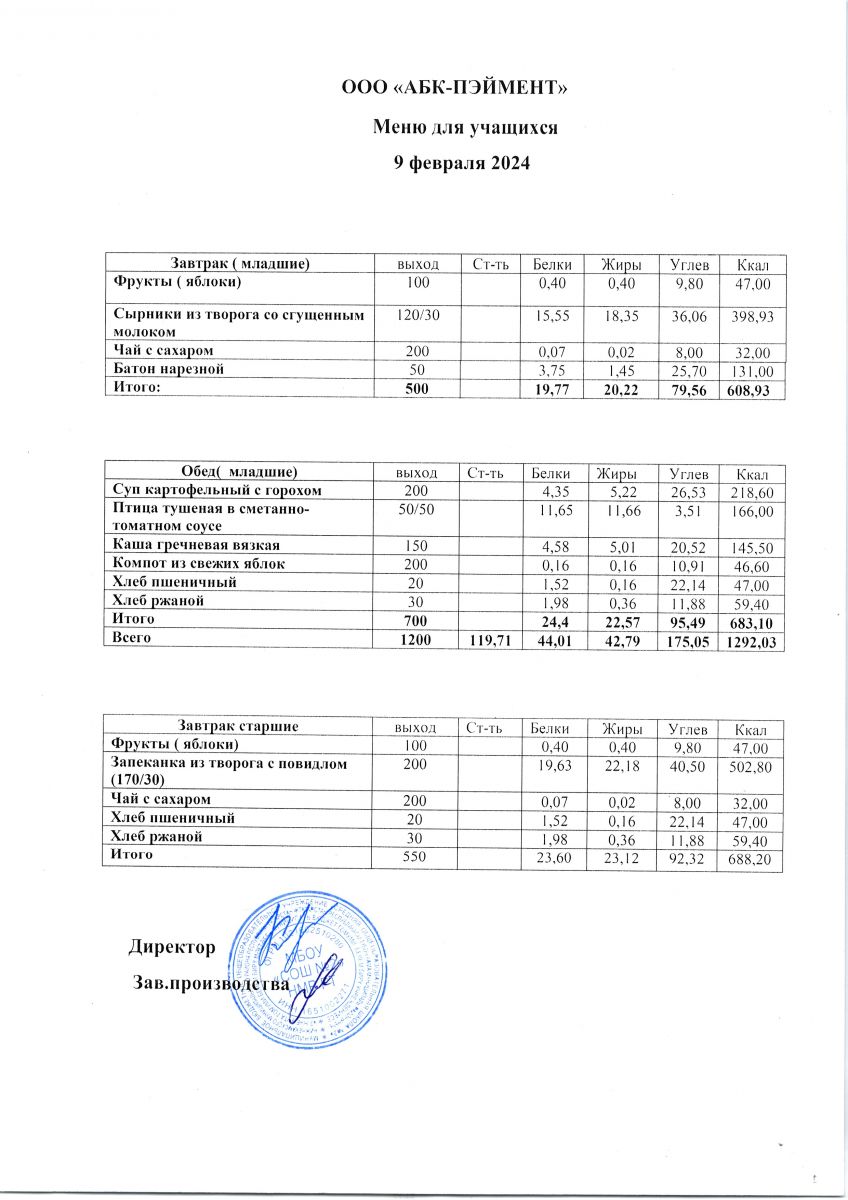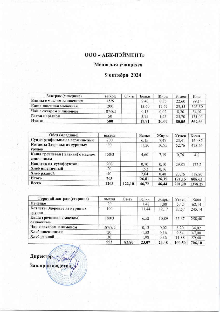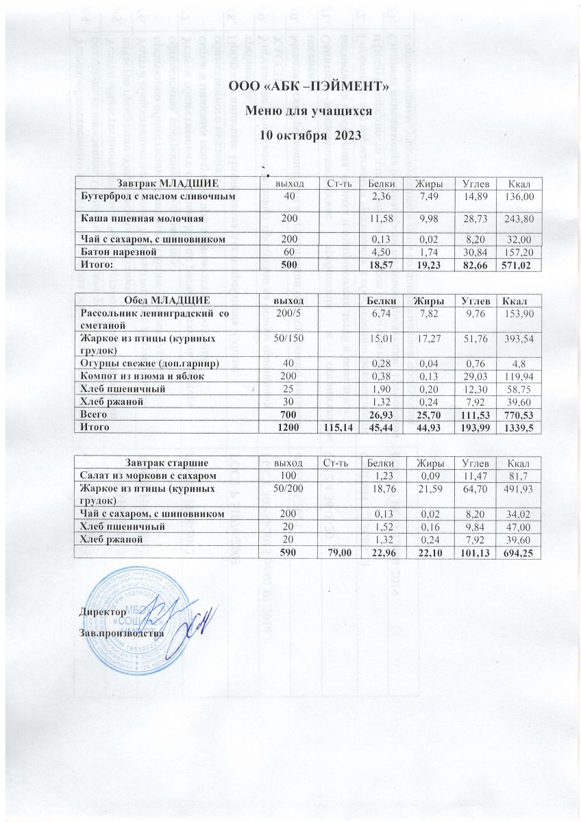 МЕНЮ на 09.10.2023