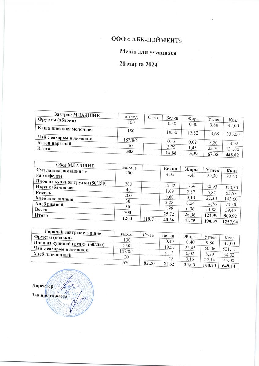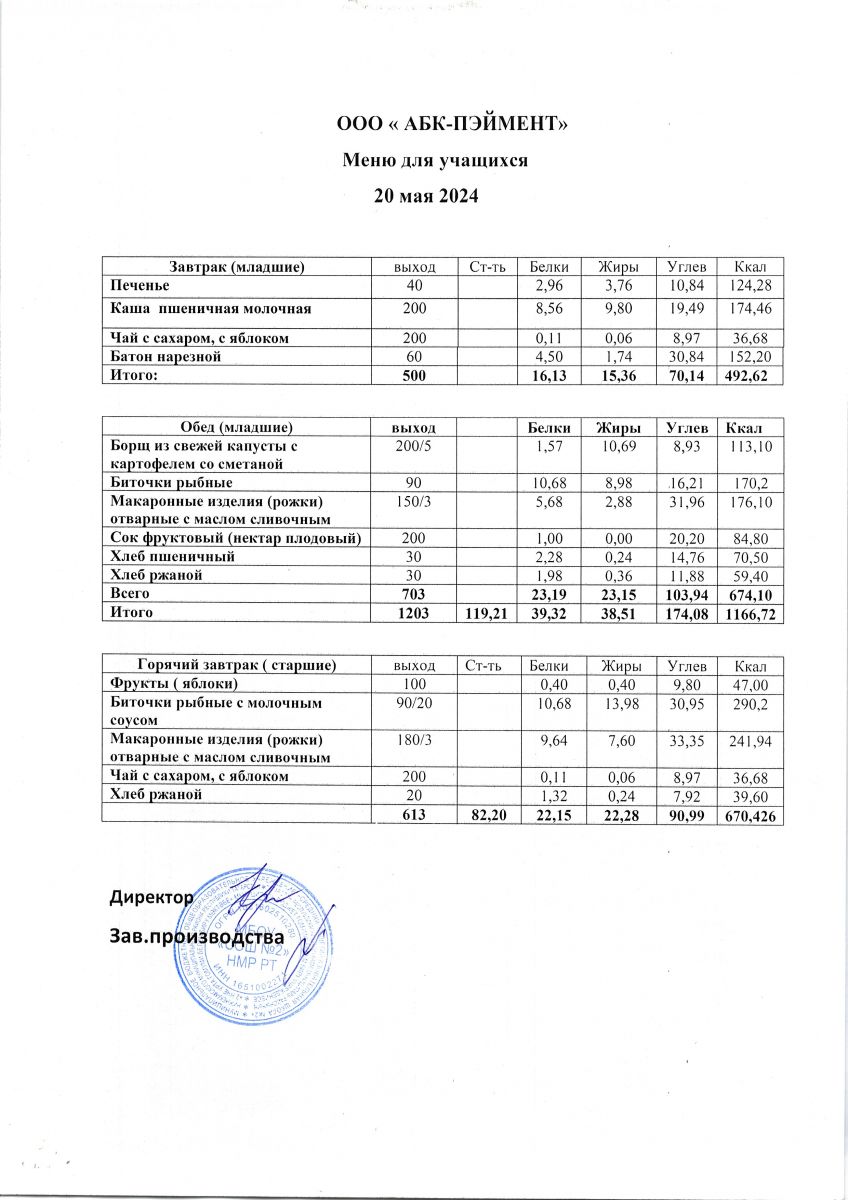 Меню на 20.05.2025