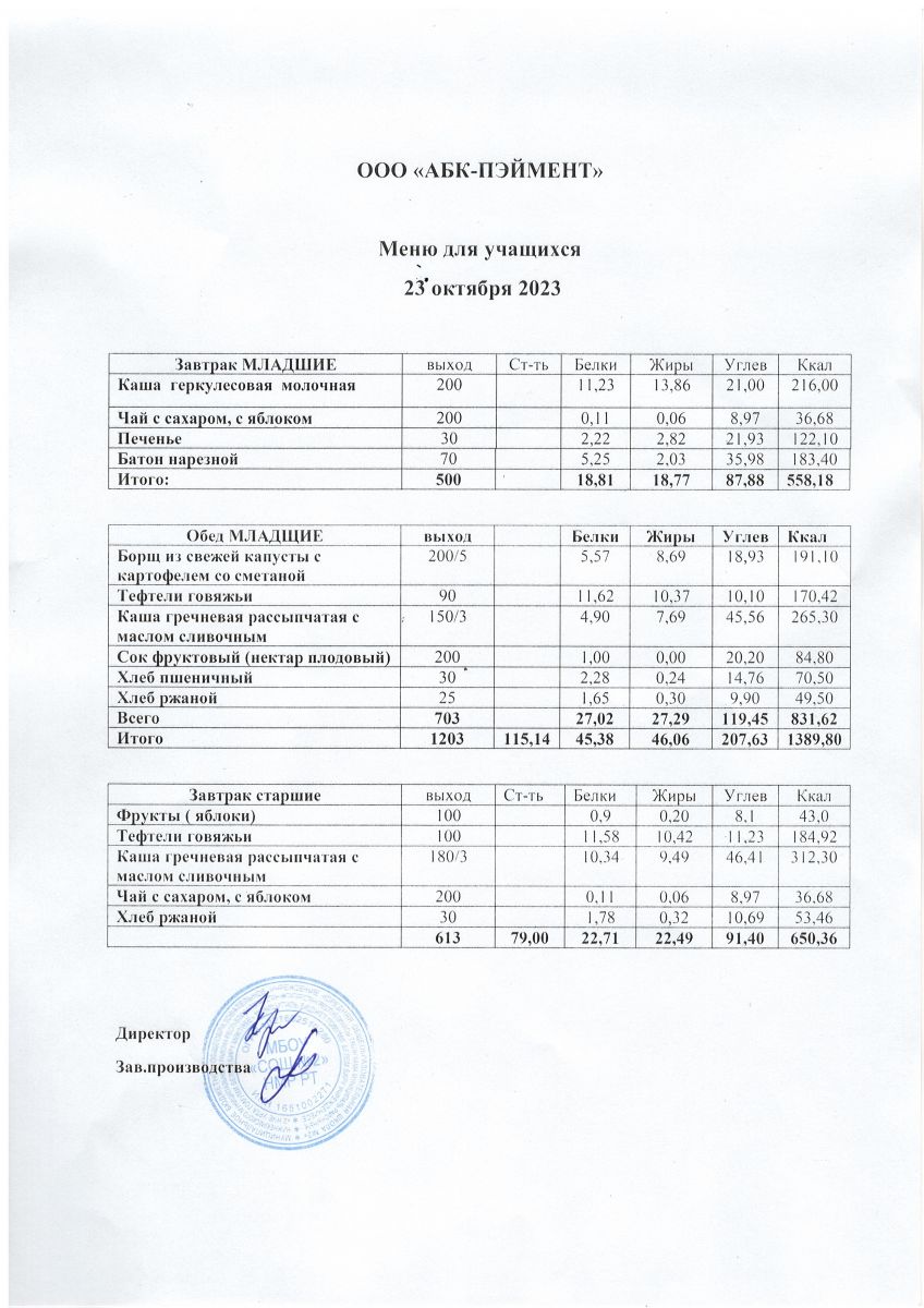 МЕНЮ на 23,10,2023