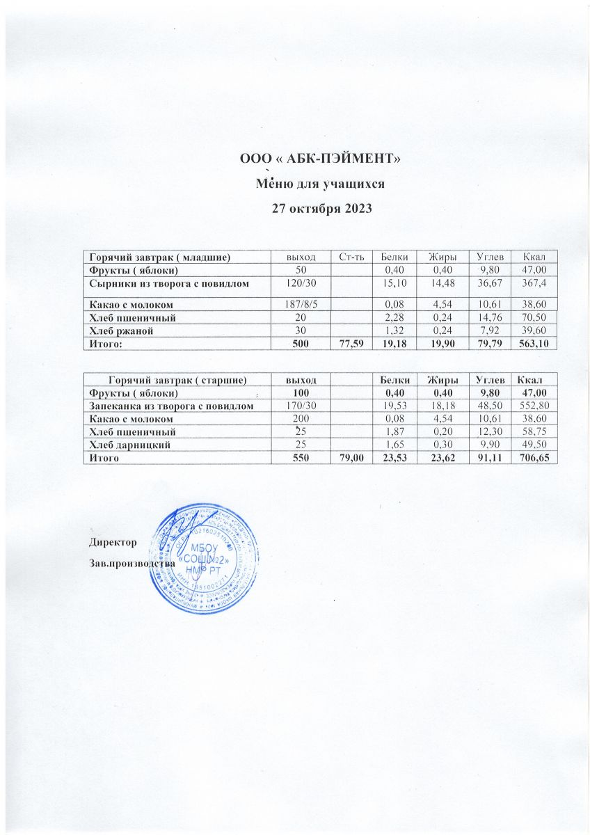 МЕНЮ на 27.10.2023