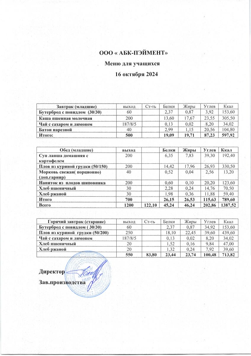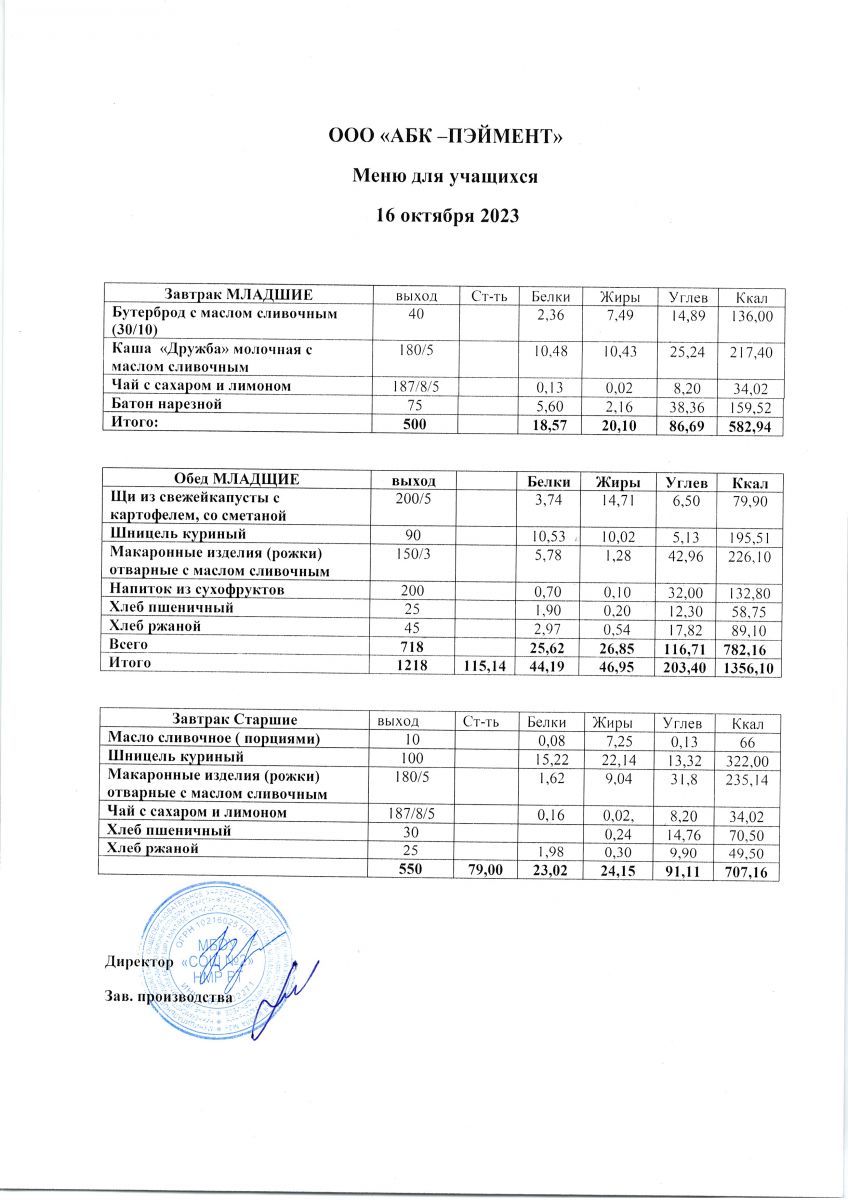МЕНЮ на 16.10.2023
