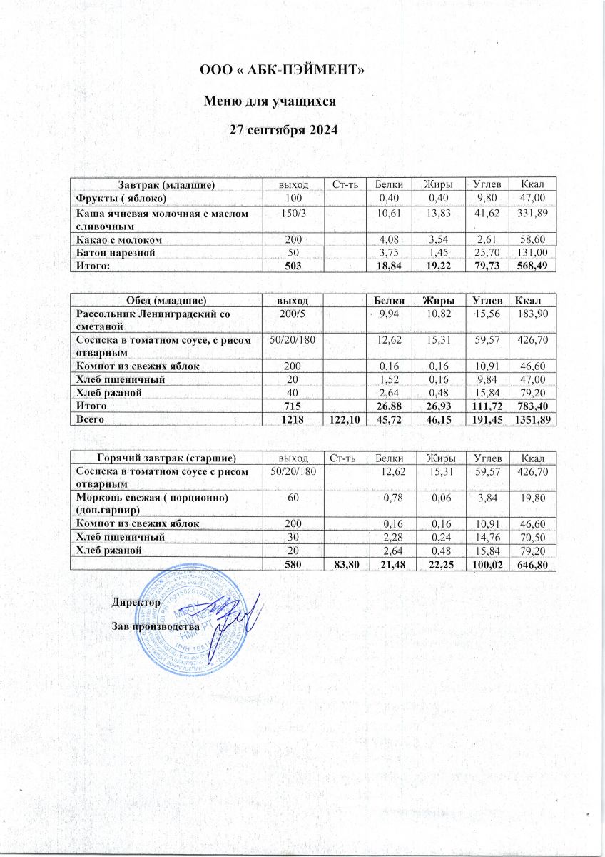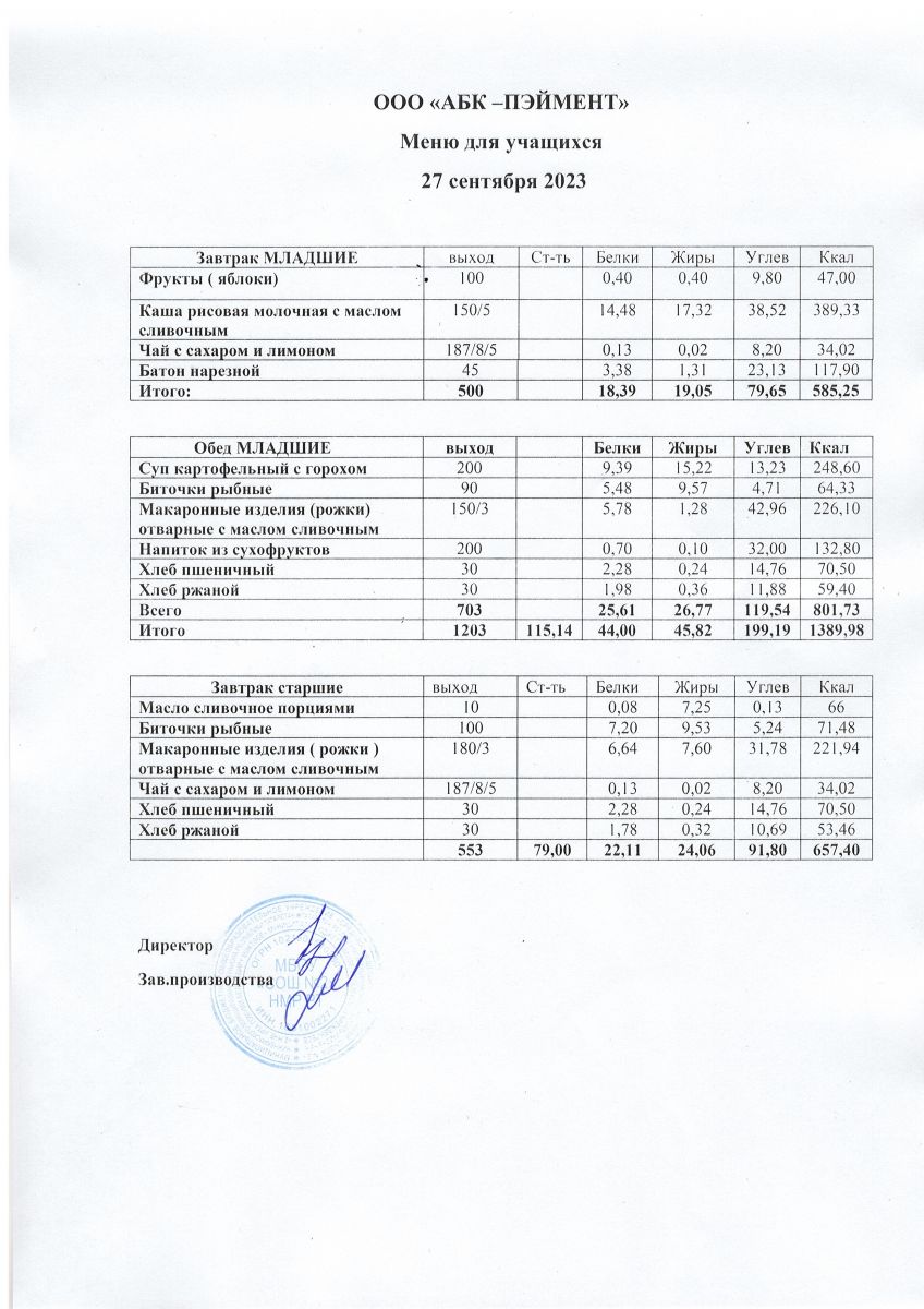 МЕНЮ на 27.09.2023