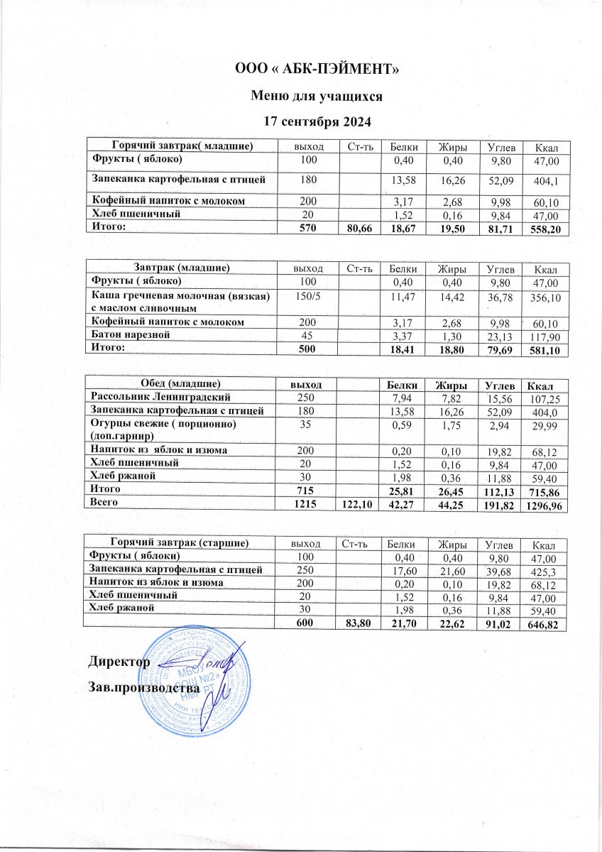 Меню на 17.09.2025