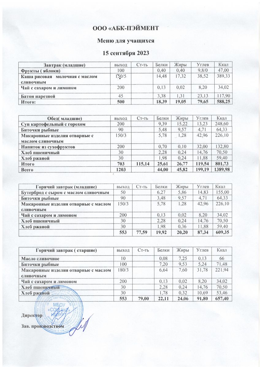 МЕНЮ на 15.09.2023