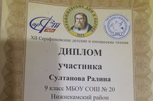 В рамках месячника родных языков и года национальных культур и традиций ученица 9 класса Султанова Ралина (руководитель учитель родного языка и литературы Гарифуллина Л.А.) участвовала в XII Всероссийских Серафимовских детских и юношеских чтениях. 11.02.2023