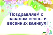 Поздравляем всех с началом весенних каникул! Желаем больше отдыхать, гулять, общаться с друзьями и не забывать про занятия. 3 апреля ждем вас всех здоровыми и невредимыми в школе. Счастливых каникул!!!