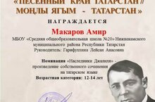 Ученик 8А класса Макаров Амир (руководитель учитель родного(татарского) языка Гарифуллина Лейсан Анасовна) участвовал в V региональном конкурсе чтецов «Песенный край- Татарстан 22.02.2023