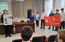 Члены союза офицеров городского совета ветеранов Тартмина Л. М, Дьячков А. С, Халиков Р( ветеран боевых действий) вручили учащимся копию Знамя Победы"