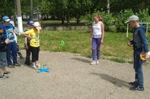 Играют ребята из пришкольного оздоровительного лагеря"Зорька" на свежем воздухе -