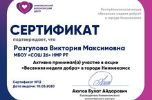 В этом году республиканская акции "Весенняя неделя добра" прошла в онлайн-формате. Ученики могли выполнять задания и получать баллы, после чего получили сертификаты. Ученица 5В класса, Разгулова Виктория активно участвовала в этапах и получила заслуженный сертификат.