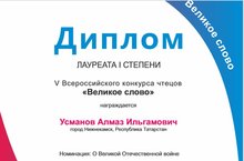 08 апреля в Центре педагогических технологий «Синтез» прошёл V Всероссийский конкурс чтецов «Великое слово».Ученики 1 Б класса приняли участие в этом конкурсе. Их номинация была: «Видеоролик «Стихи о Великой Отечественной войне».Усманов Алмаз получил Диплом 1 степени, Дмитриева Маргарита — Диплом 2 степени.Мы очень гордимся вами, ребята! -