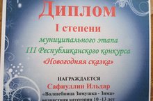 На республиканском конкурсе"Новогодняя сказка" ученик 5 класса Б Сафиуллин Ильдар предоставил свои работы - фотографии окружающей природы и получил диплом 1 степени. "Мир фотографий удивителен, загадочен, - считает Ильдар. - И каждый может увидеть это чудо - красоту нашего края". "Дерзайте, и у вас все получится!" - утверждает его наставник, классный руководитель Полуляхова Наталия Алексеевна. Успехов в творческом деле, Ильдар!