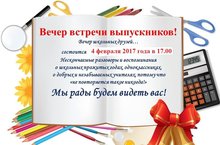 Вечер встречи выпускников, вечер школьных друзей состоится 4 февраля 2017 года в 17:00. Мы рады будем видеть вас дорогие выпусники и учителя!!