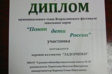 Дипломом участника награжден хоровой коллектив школы "Задорники" за участие в муниципальном этапе Всероссийского фестиваля школьных хоров "Поют дети России", руководитель: Терентьева Наталья Викторовна, концертмейстер Кариева Елена Николаевна. Поздравляем!