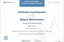 Поздравляем Желтякову Дарью ученицу 10А класса, которая приняла участие в международной олимпиаде по английскому языку "Global Ambassador Olympiad". Дарья набрала 53 балла из 60 и получила сертификат за 3 место. Поздравляем! Так держать!
