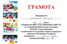 Ученик 3Б класса Кривошеев Арсений третий год ходит в секцию спортивной борьбы. В октябре он принял участие в Первенстве МБУ «СШ «ДИНАМО» НМР РТ» по спортивной борьбе среди мальчиков, посвящённом Году родных языков и народного единства в Республике Татарстан и получил Грамоту за 3 место. «Быстрого и лёгкого болезнь не догонит!». Только вперёд и только к победам!
