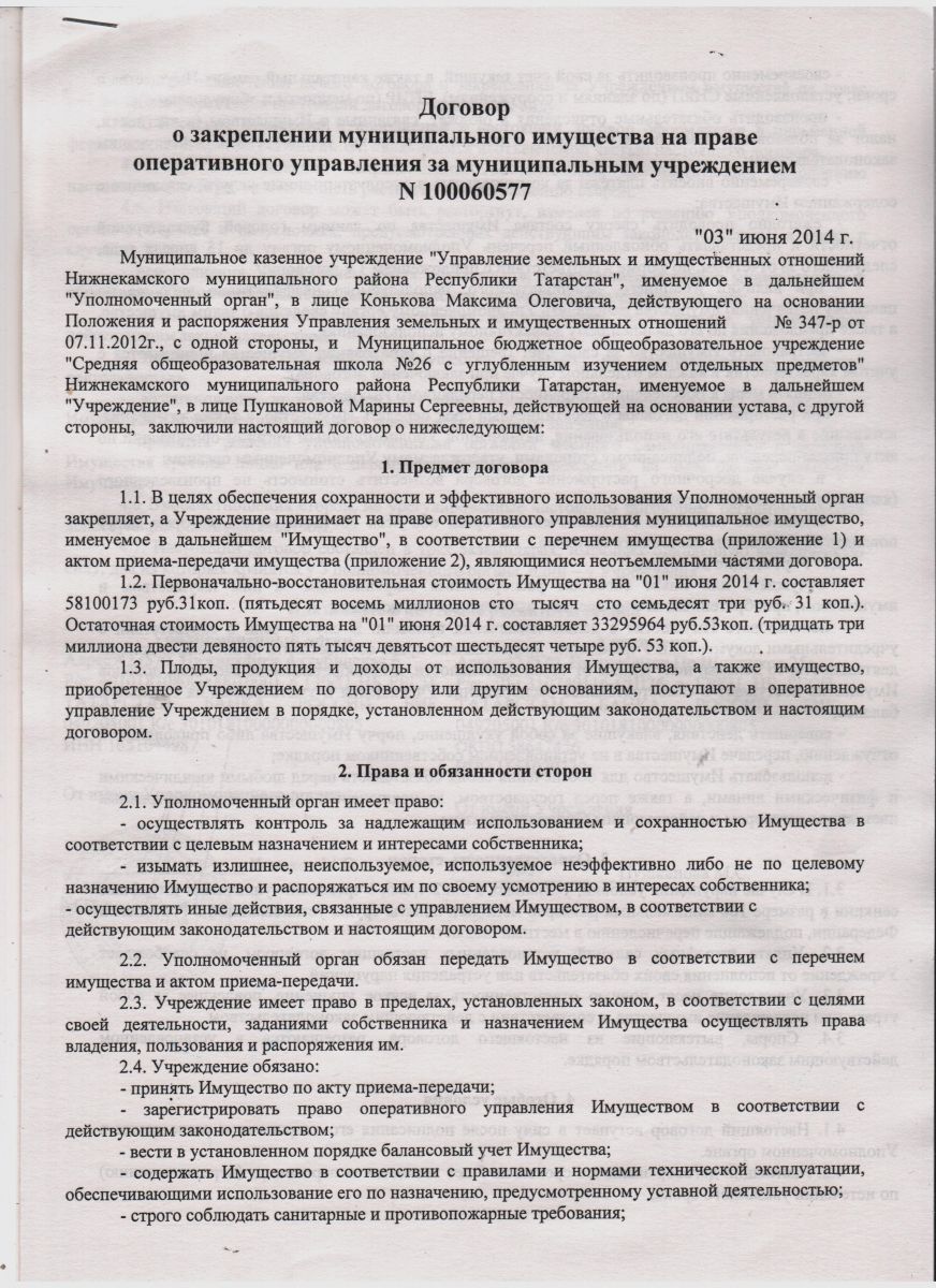 Договор о закреплении муниципального имущества на право оперативного управления за муниципальным учреждением № 100060557