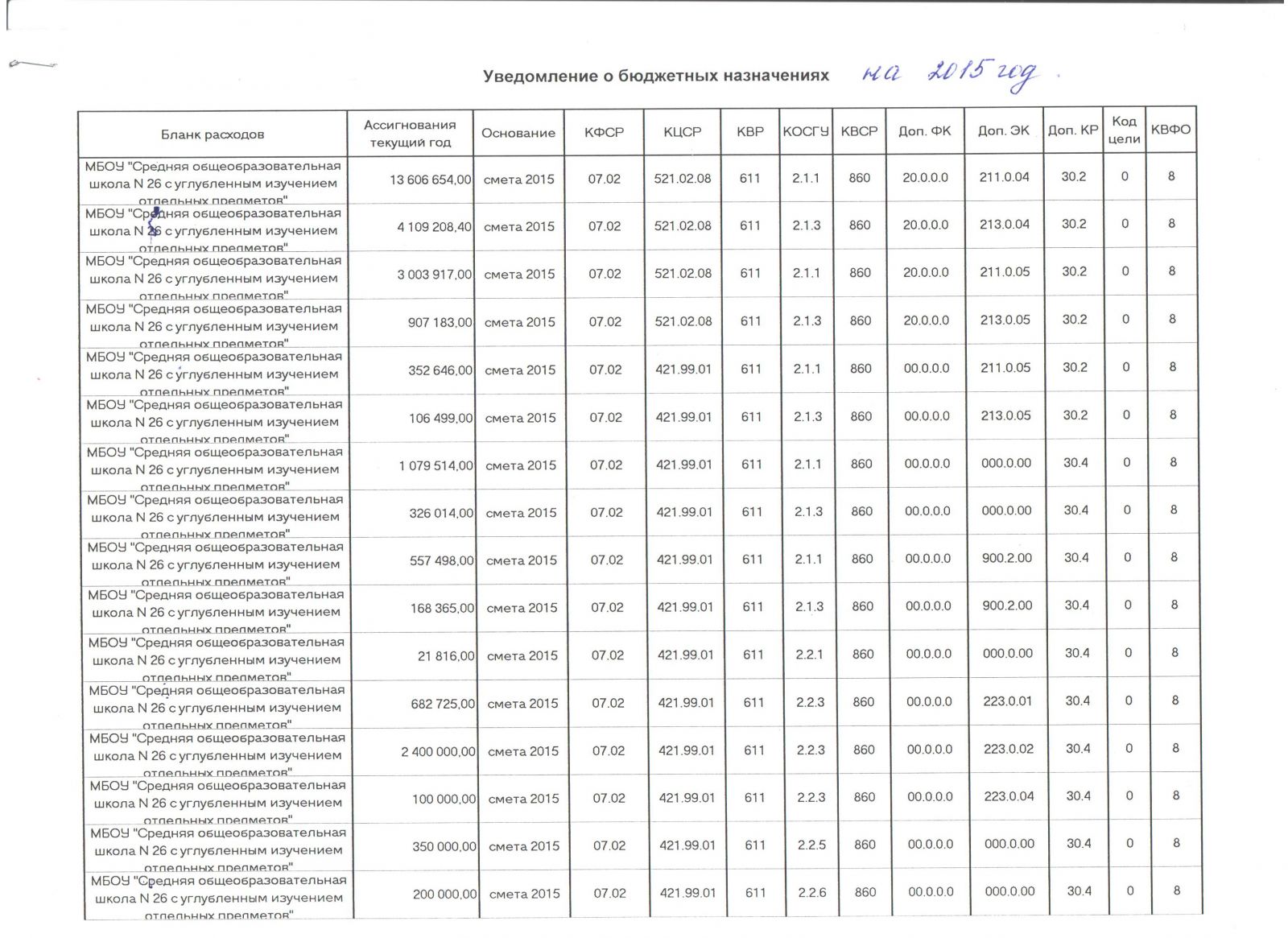 Уведомление о бюджетных назначениях на 2015 год