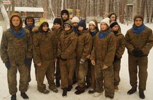 В первый день каникул 8 Б класс и родители отправились в зимний лес, где участвовали в игре пейнтбол.