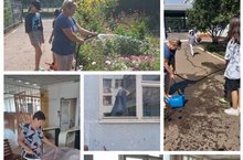 Педагоги, тех.персонал и учащиеся школы наводят порядок в школе к приёмке школ города. Каждый день ребята вместе с педагогами наводят порядок с наружней стороны школы: пропалывают траву, поливают клумбы с цветами, подметают территорию. Тех.персонал ведут работы внутри школы. Все трудятся на славу. -