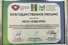 В Молодёжном центре "Ковер" состоялось награждение лучших школ по волонтерской деятельности. Волонтерский штаб МБОУ «СОШ №28» НМР РТ (руководитель штаба Сагитова Алина Рамилевна) был награжден благодарственным письмом за активное участие в создании единого вектора концептуального развития добровольчества, а также повышение эффективности работы волонтерского движения НМР. Спасибо огромное нашим волонтёрам за отличную работу! Гордимся!