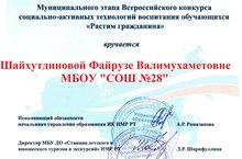 Подведены итоги Муниципального этапа Всероссийского конкурса социально-активных технологий воспитания обучающихся "Растим гражданина". Поздравляем заместителя директора по воспитательной работе Шайхутдинову Файрузу Валимухаметовну!