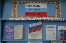 Заведующая школьной библиотекой Захарова Л.П. оформила выставку "Символы, которыми гордится страна", где размещены книги, журналы, статьи, посвященные Дню флага в РФ.