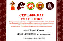 Музею Боевой Славы вручили сертификат за участие в Республиканском смотре-конкурсе школьных музеев Боевой Славы образовательных учреждений Республики Татарстан "Юнармейцы - хранители воинской славы", посвященного 100-летию образования военных комиссариатов. Поздравляем! Гордимся!