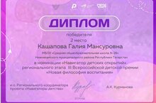 Поздравляем Кашапову Галию Мансуровну с дипломом победителя за 2 место регионального этапа III Всероссийской детской премии «Новая философия воспитания» в номинации «Навигатор детских открытий». Молодец, Галия Мансуровна! Школа гордится Вашими успехами! Желаем дальнейших Вам побед!