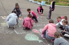 Учащиеся начальных классов сегодня приняли активное участие в конкурсе рисунков на асфальте "Счастливое детство". Школьный двор запестрел яркими красками детства. Ребята разделились на команды мальчиков и девочек. Они решили рисовать города - счастья. Более солнечный город получился у девочек, они рисовали дружно и коллективно. У мальчиков получился у каждого свой рисунок. После конкурса рисунков педагог Завалина Т.И. организовала подвижные игры.