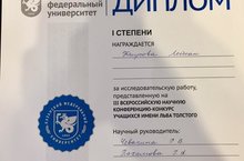 31 нче октябрь көнне Казан федераль университетында Лев Толстой исемендәге III Бөтенрәсәй фәнни -тикшеренү конференциясе уздырылды. 11 нче А сыйныфы укучысы Юнысова Ләйсән (җитәкчеләре: Чевачина Р.В., Пахомова Г.Ә.) җиңүче Дипломына ия булды. Ләйсәнне зур җиңүе белән тәбриклибез, киләчәктә укуында уңышлар, фән өлкәсендә яңа үрләр яулавын телибез!